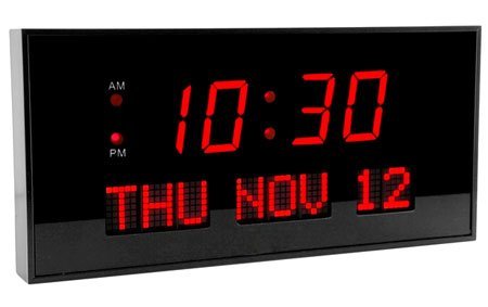 This Large LED Calendar Clock is the perfect item for Home, Office, Bedroom, Family Room or any other room or space you desire! Almost 12" wide, with a large, bright display displaying the time with 1/34 inch red numbers on top and AM and PM indicator lights. Also shows the day of the week and the date displayed along the bottom.